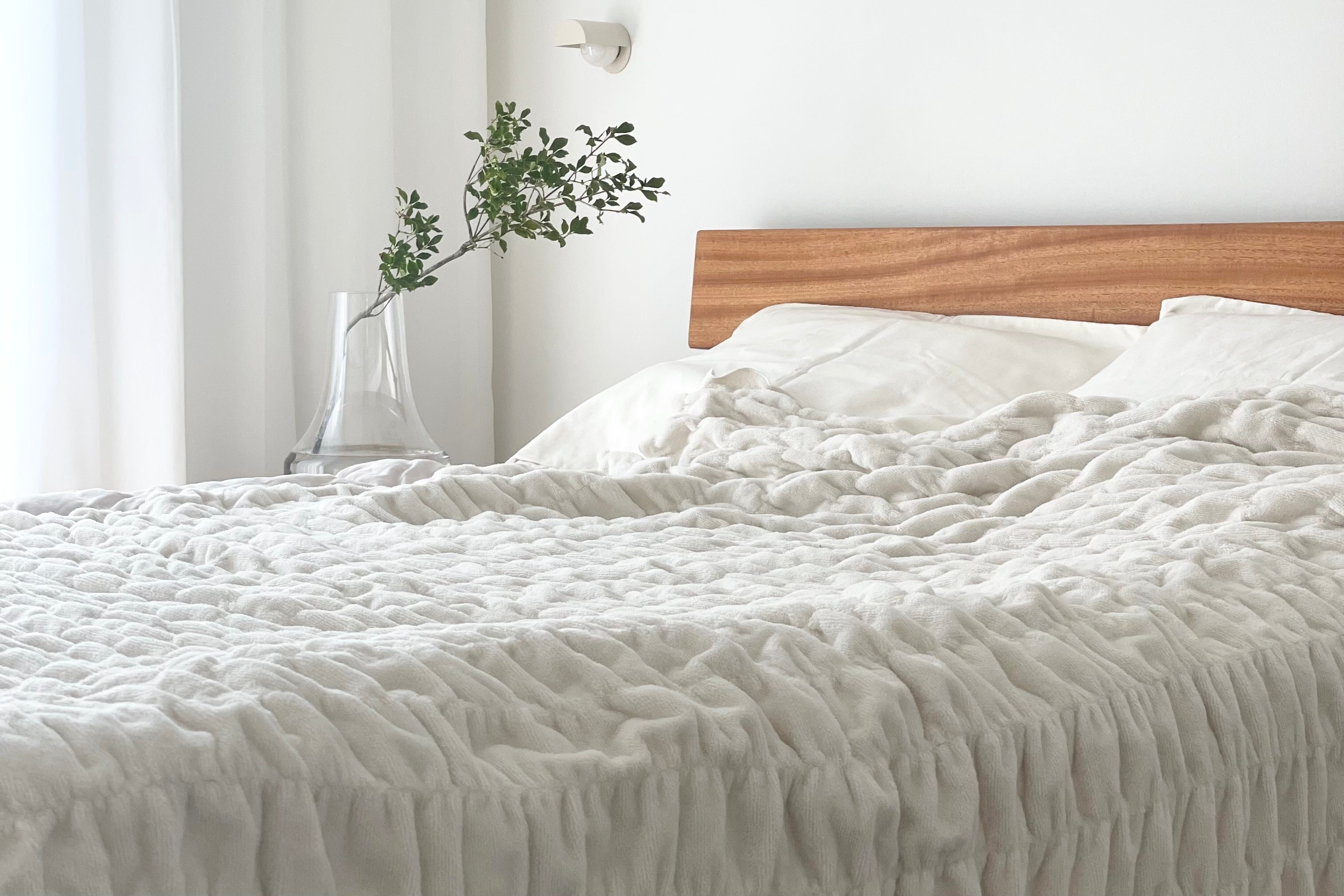 軽やかで柔らかな感触と、余計な装飾をせず自然なくしゅくしゅとした風合いによって、やさしく包み込まれるような心地よさを感じて頂ける毛布は、肌に触れる毛羽に保湿性・吸湿性を併せ持つオーガニックコットンを採用しています。綿の優しい肌触りが心地よい眠りをサポートしてくれます。