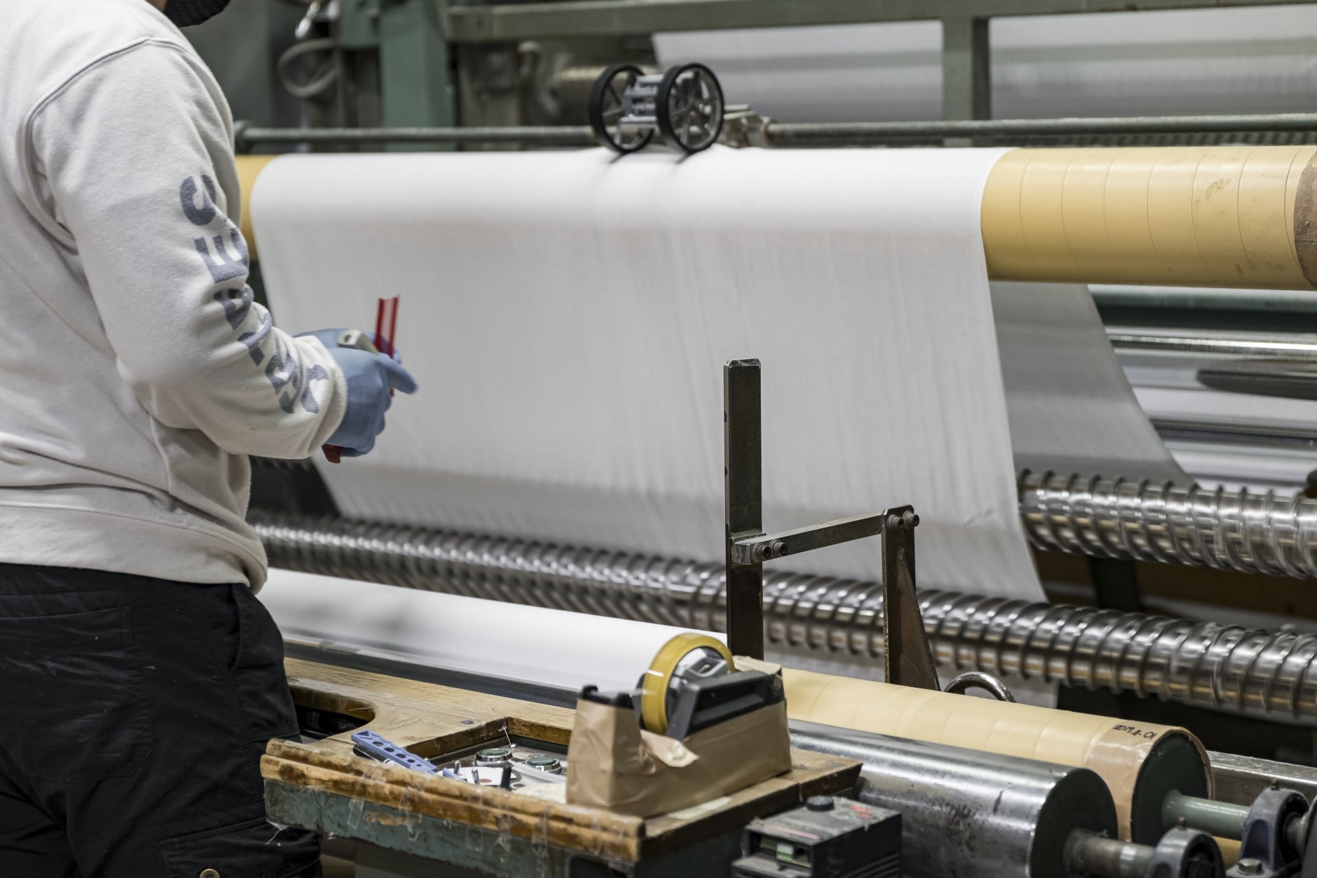 糸にテンション(引っ張り)をかけながら、予め経糸(タテ糸)に糊を付けて強度を補ったり、滑りを良くしたりするサイジングという製法があります。そうすることで生地の強度が上がるため生産性が高まります。