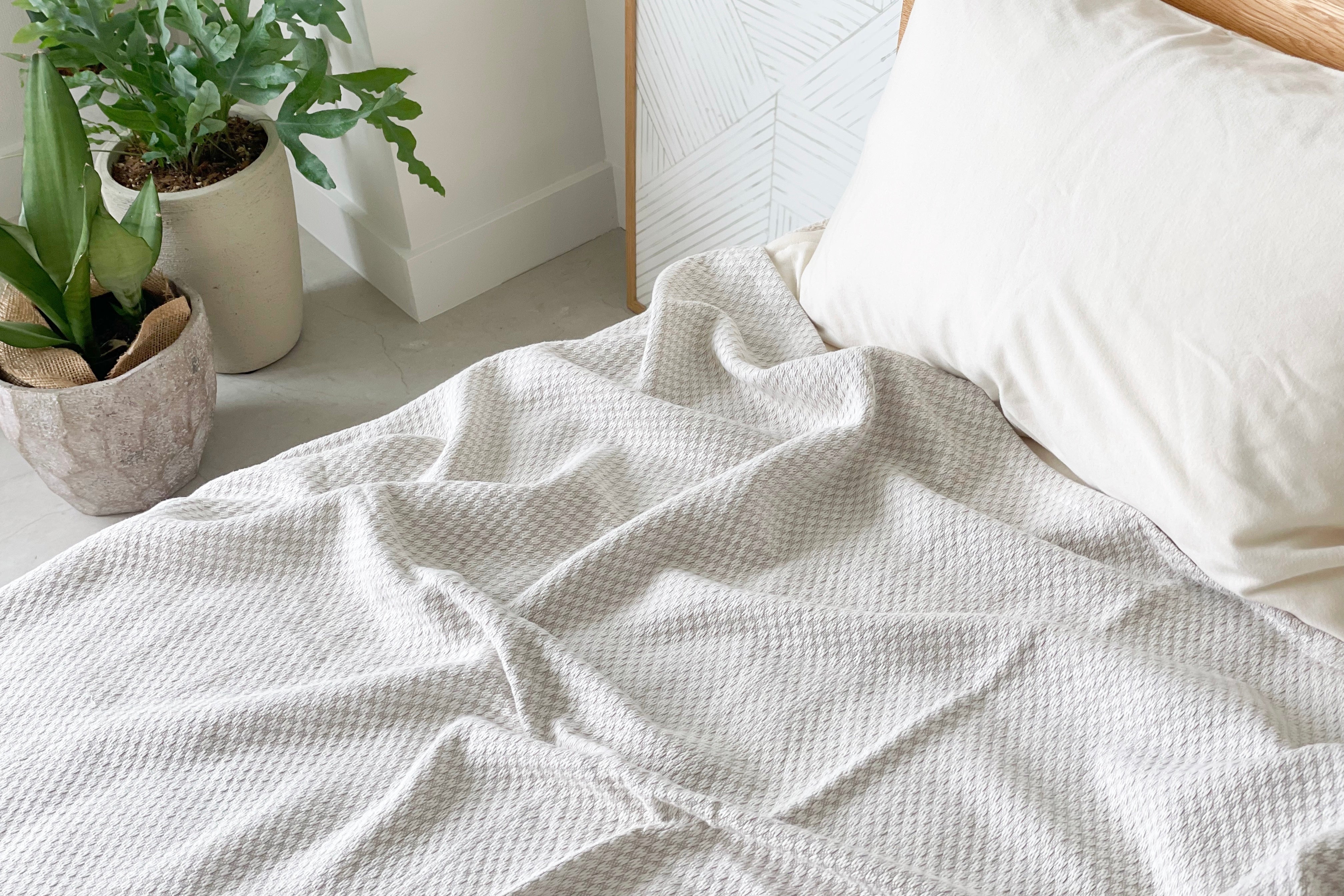 柔らかな市松模様の生地を、ふんわり優しく織り上げた綿100%のコットンケット。
