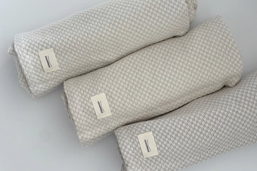 ココマニのfuwatoroコットンケットはご家庭でお洗濯(デリケート洗い)ができ、いつでも清潔にお使いいただけます。やさしくお洗濯いただくと肌触りや吸水性が上がり長く使っていただけます。