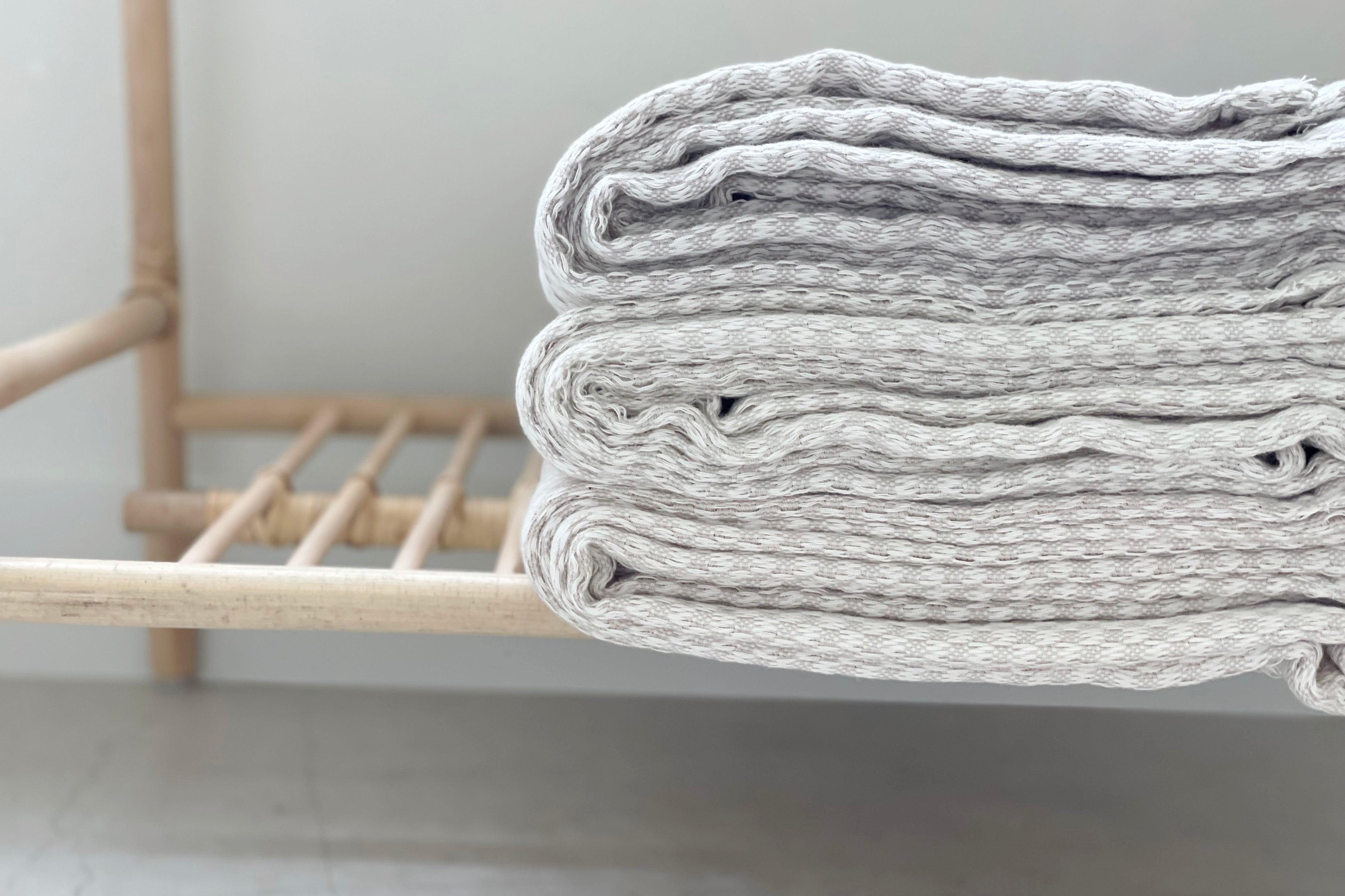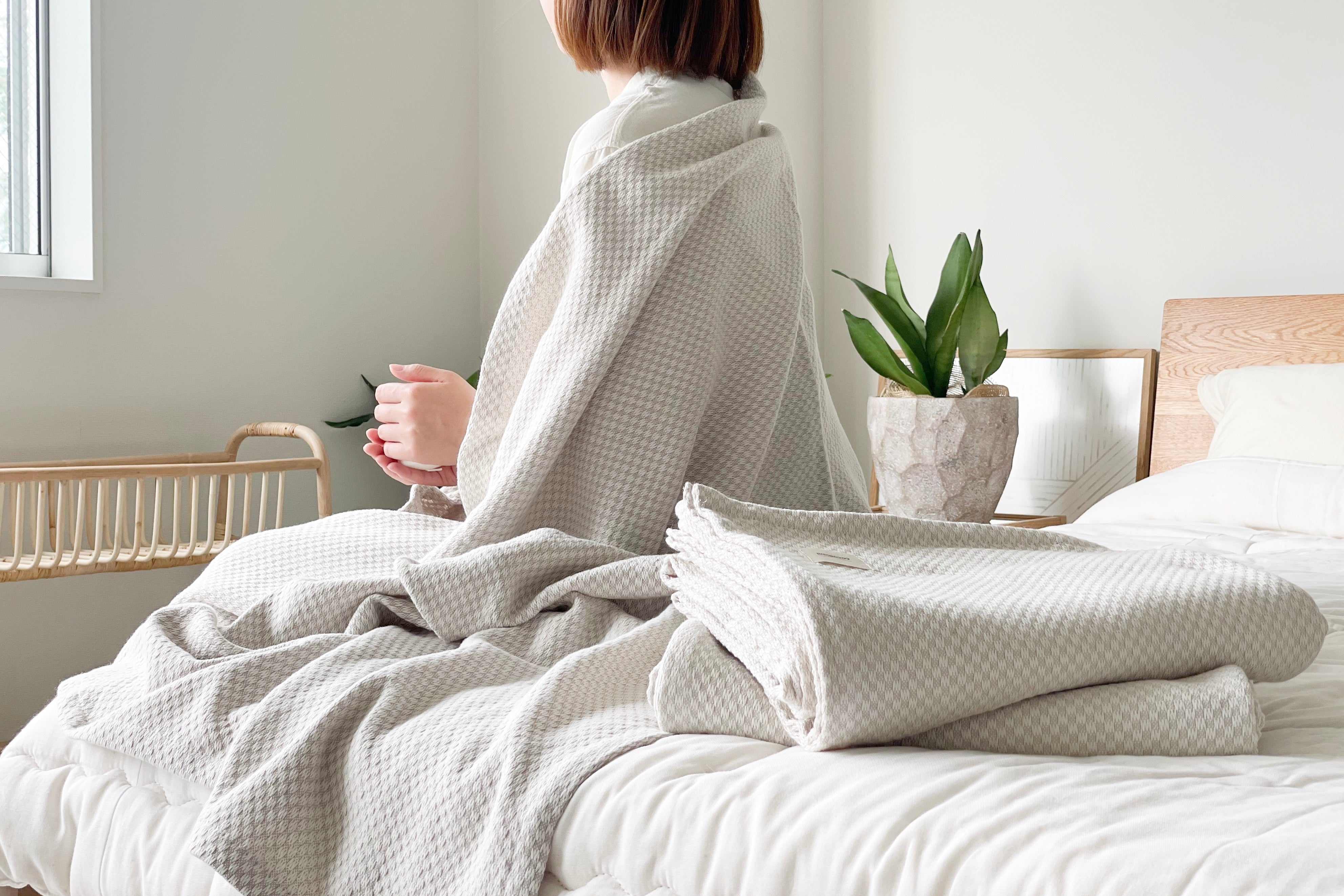 fuwatoroコットンケットは年中マルチに使えるケットです。年中使えてインテリアにも馴染むから、置き場所に困りません♪