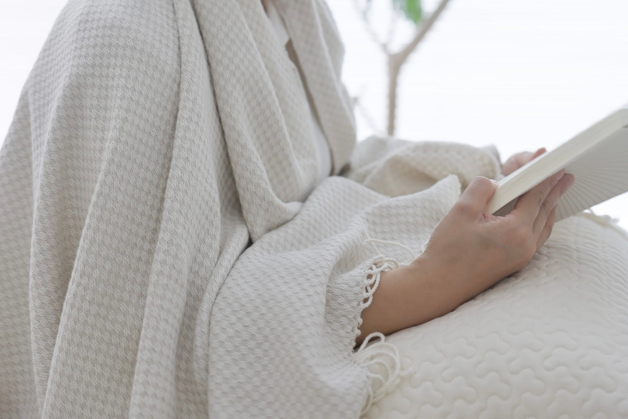 足元が寒いときは、ひざ掛けにもお使いいただけます。テレビを見たり、読書をしたり、リラックスタイムのお供にご利用ください。