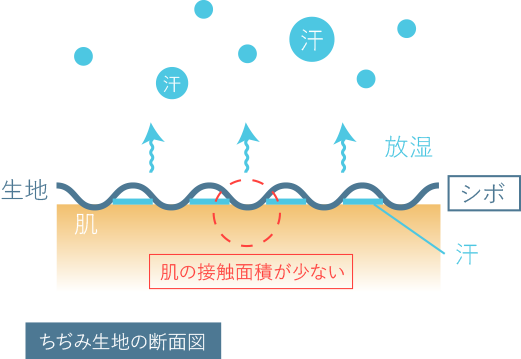 高島ちぢみは通常の平織りに比べ、緯糸(よこいと)の撚り(より)の回数を約2倍以上にひねる事により生じるシボ(凹凸)で肌に触れる面積を少なくし、 織り糸の本数も通常180本のところ120本で織り上げる事で、隙間を多く、風通しが良くなるように仕上げています。そのため、汗をよく吸い、早く乾く性質を持っています。強撚糸を織り糸に使用し、伸び縮みする事により、汗をかいても肌にはつかずベタつきません。
