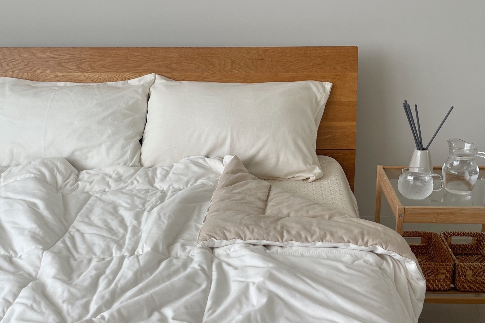羽毛布団の下に入れるとコットンの心地よさを感じます
